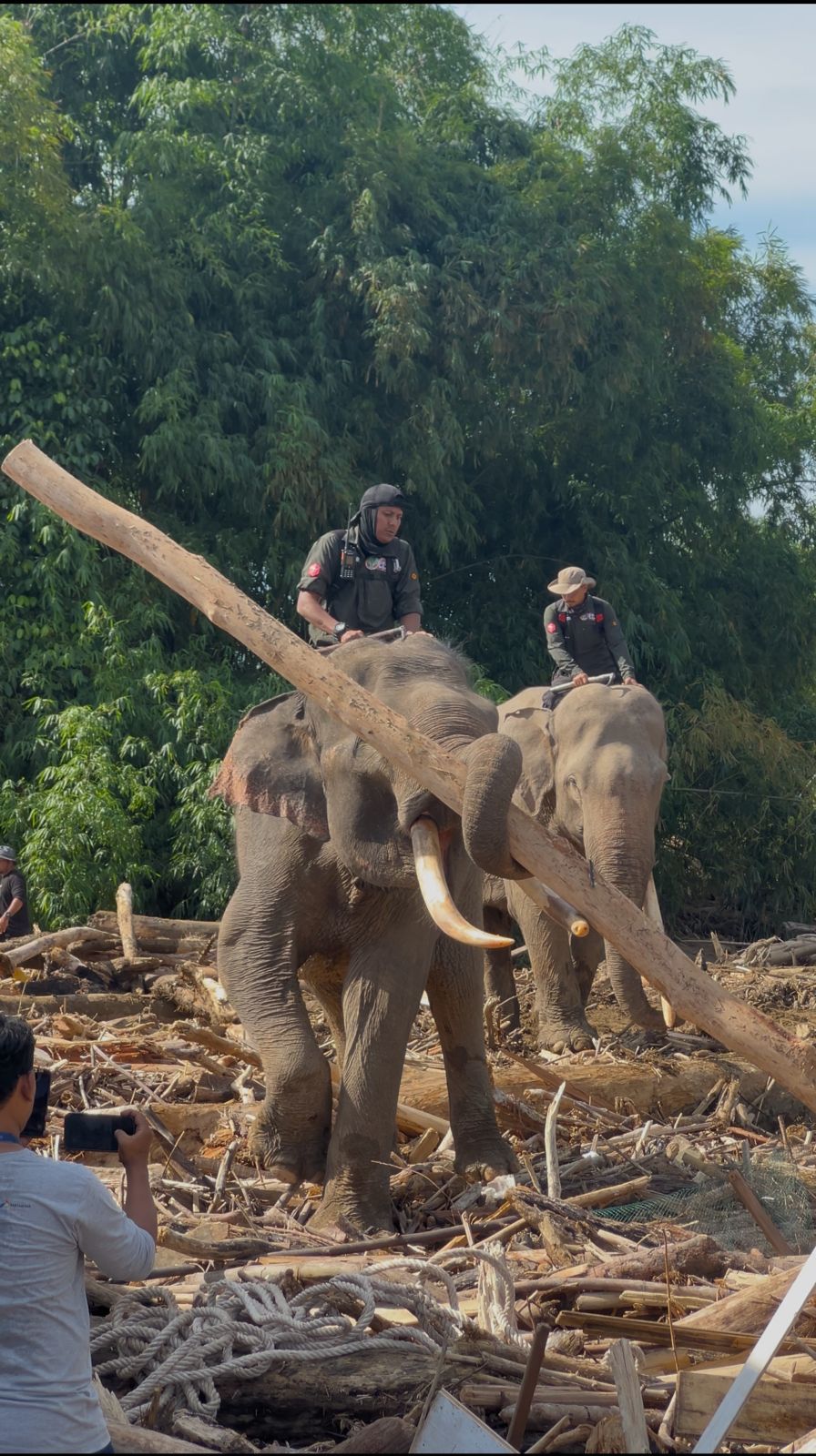 “Empat gajah yang kita datangkan bersama BKSDA Aceh hari ini sudah berada di lokasi. Mereka langsung kita kerahkan untuk menarik kayu-kayu besar serta material berat lainnya yang menumpuk akibat banjir,” ujar Iptu Fauzi.